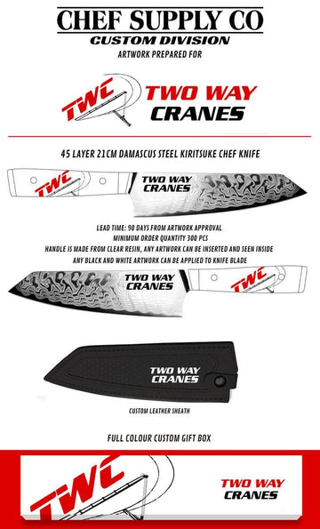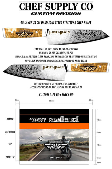 - Heavy Weight: Full custom Damascus knife with a leather sheath and a full-colour gift box, starting at $117 AUD (MOQ 300 pcs).