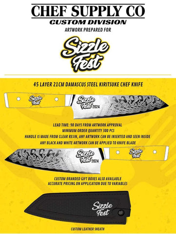 - Commemorative Blade: Custom "Sizzle Fest 2024" branding applied in high-contrast black and white to the Damascus steel.